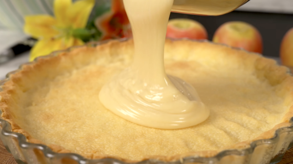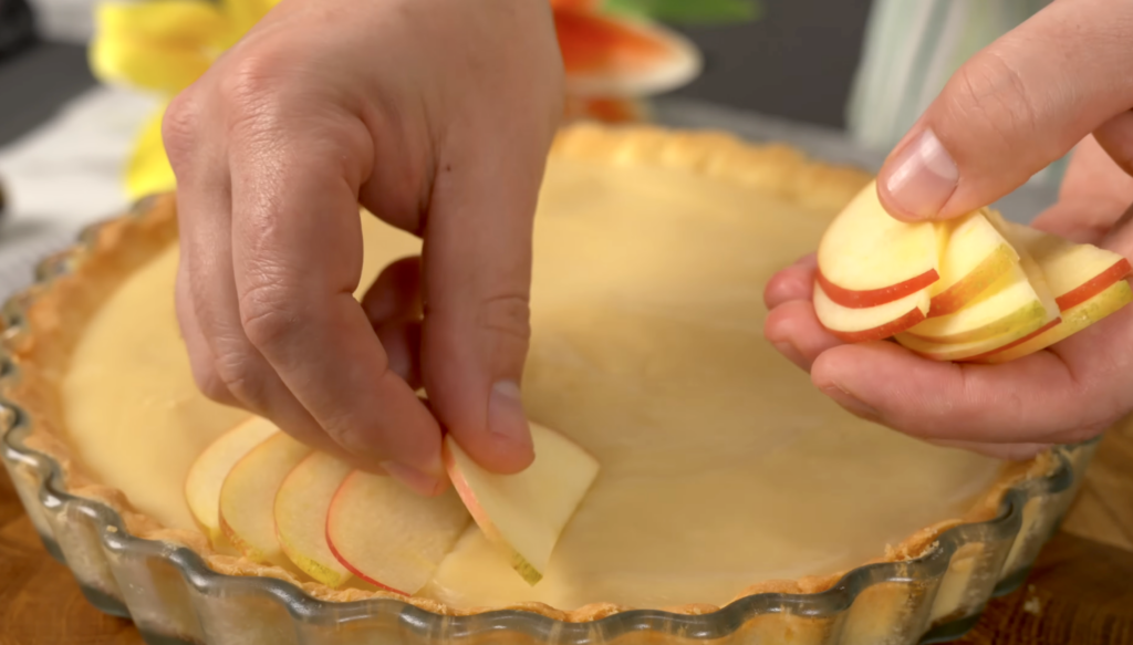 • Assemble the tart: Roll out the dough and place it in a greased tart pan. Add the cream and arrange sliced apples on top.